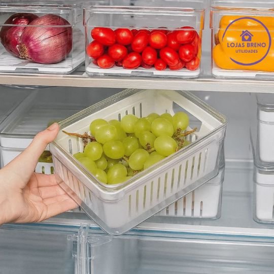 Kit 8 Potes Organizador Geladeira Acrílico com Tampa e Cesto Lavagem 1,36L Verduras Frutas Vegetais