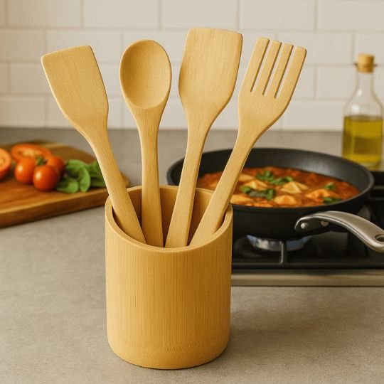 Kit Utensílios de BAMBU 5 peças cozinha colher de pau, espatula com base