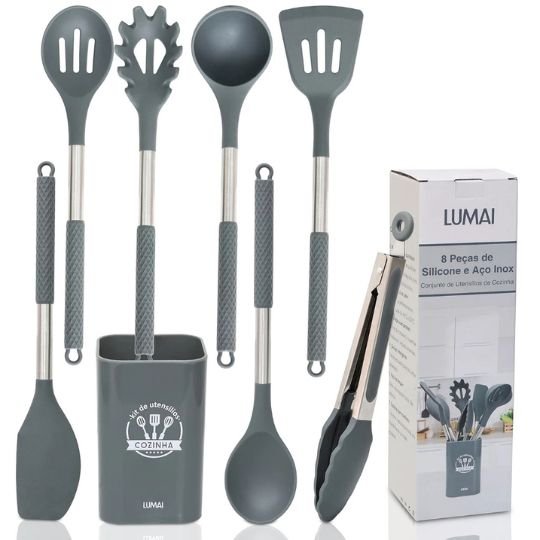 Kit 8 Utensílios de Cozinha de Silicone e Aço Inox Grandes com Balde