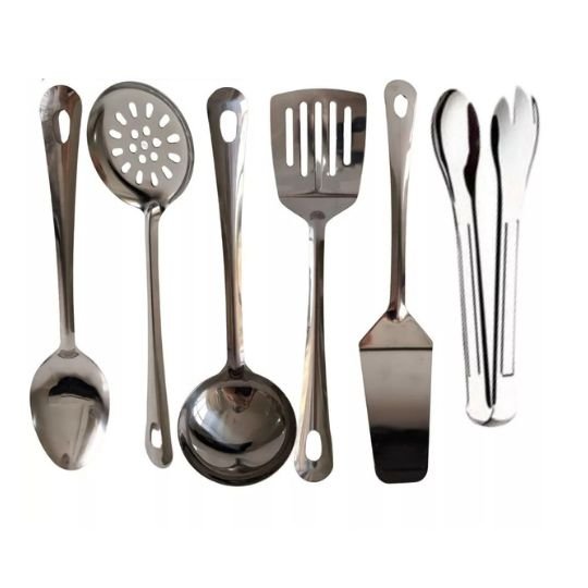 Jogo de Utensílios Para Cozinha Kit 6 Peças Aço Inox Colher de Servir Concha de Feijão Escumadeira Espátulas Pegador